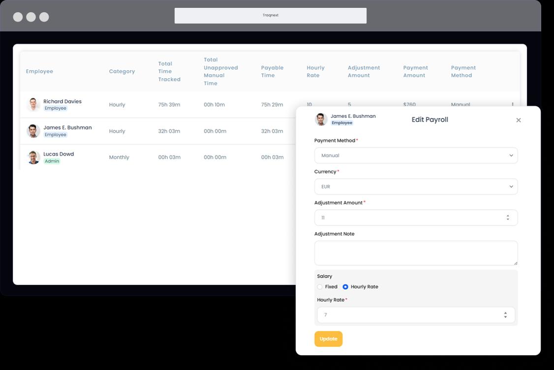 Managing time tracking, approving logs, and running payroll can become quite cumbersome, especially as your company grows and works with global outsourced teams. TraqNext simplifies payroll processing by automating time tracking and ensuring seamless integration with your payment workflows.
