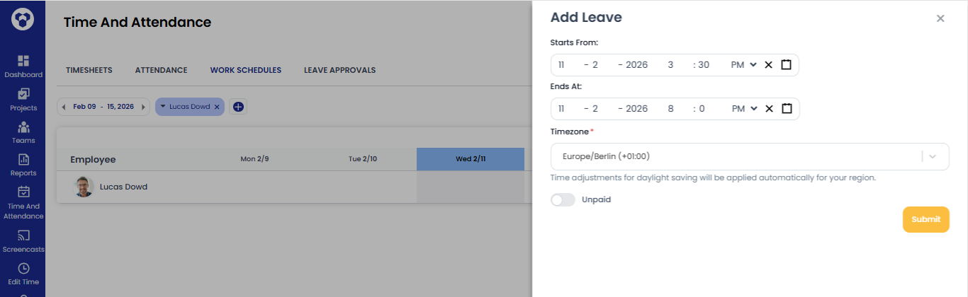- Enter the time for your leave, enable the Unpaid toggle button, and then click the Submit button.