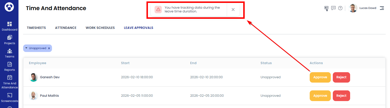 - If a user’s leave is already added but not approved, and the user has tracking data during the same leave time, a message will be shown to the admin/manager/owner when they try to approve the leave request.
