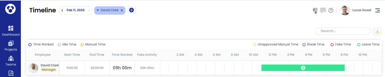 - In reports like Activity Summary and Timeline, leave time will be shown in green with a dollar sign.