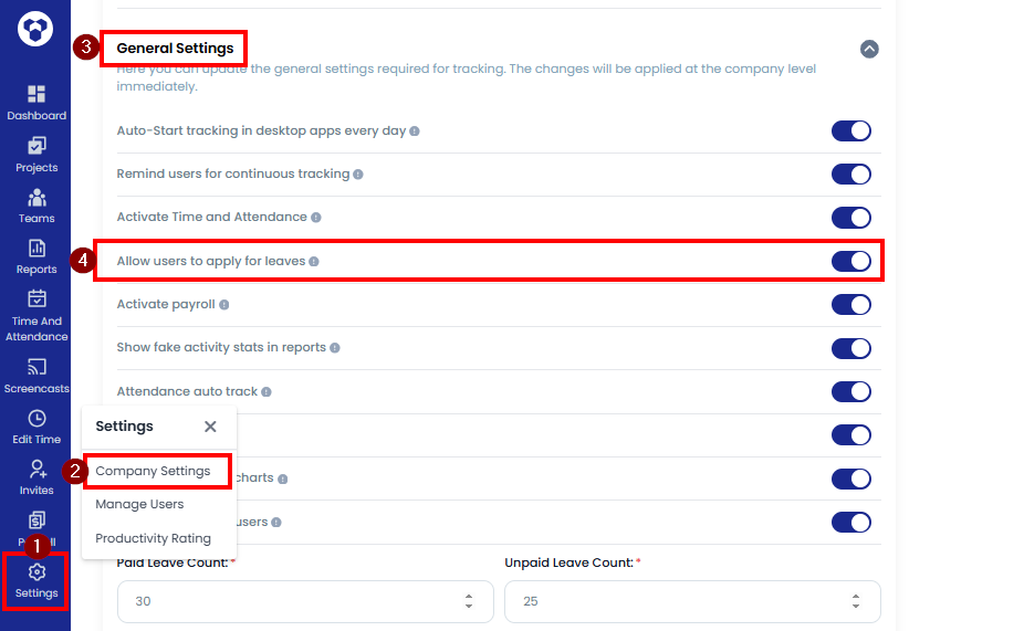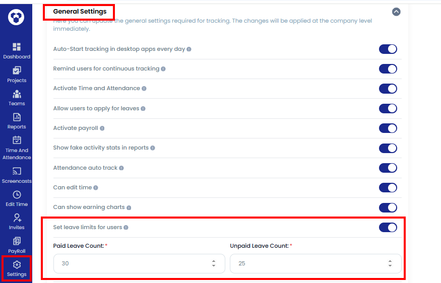Users can submit Paid and Unpaid leave requests only up to the limits set in the company settings.