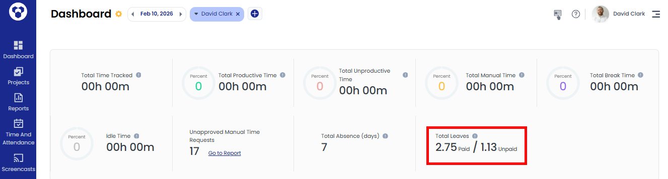 When a paid / unpaid leave request is approved by an Owner, Admin, or Manager, its status is updated and it is added to the Total leave count on the dashboard.