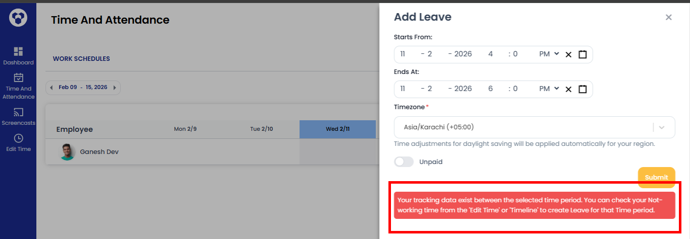 - If a user has tracking data for a specific time, a leave request will not be created for that time, and a message will be shown to the user.
