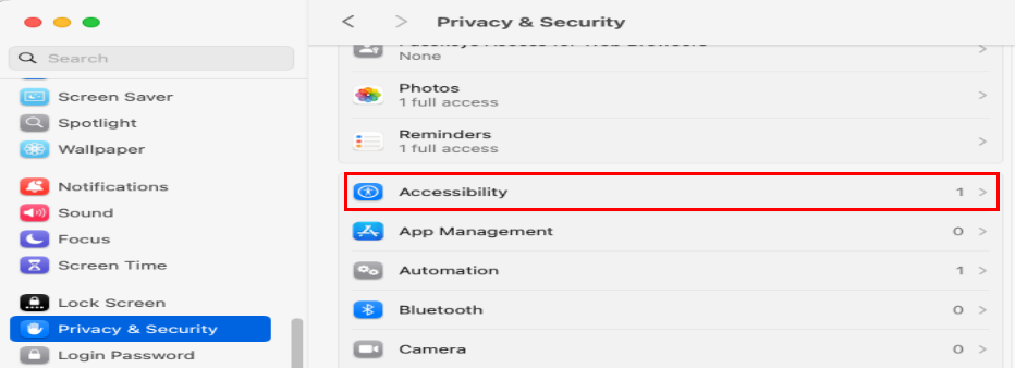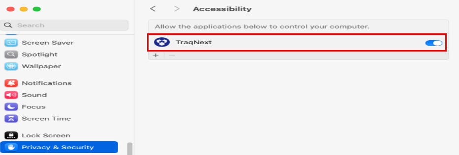 - Go to Privacy & Security, select Accessibility, and turn on the TraqNext toggle.