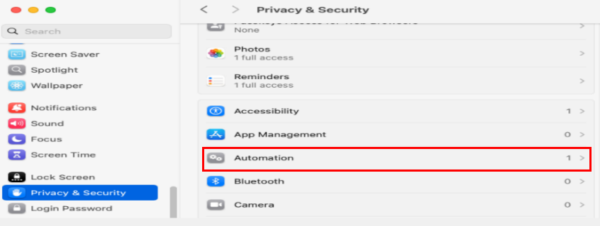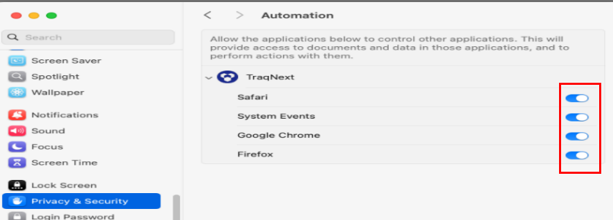 - Under Privacy & Security, choose Automation and then turn on the TraqNext toggle for all browsers.