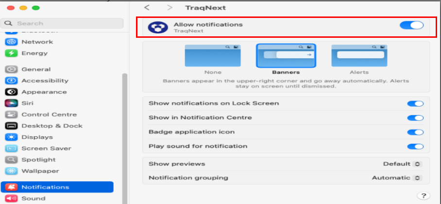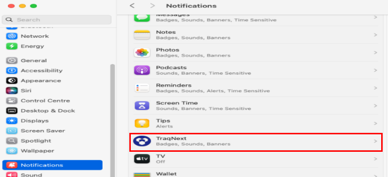 - In System Settings, open Notifications, choose TraqNext, and turn on Allow Notifications