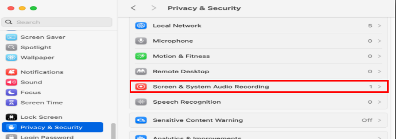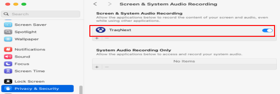 - Under Privacy & Security, choose Screen & System Audio Recording and then turn on the TraqNext toggle.