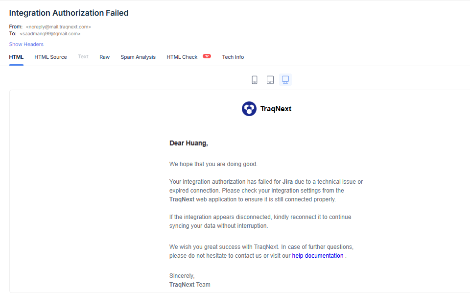 If authentication fails due to Jira’s policies, TraqNext sends you a notification email.
