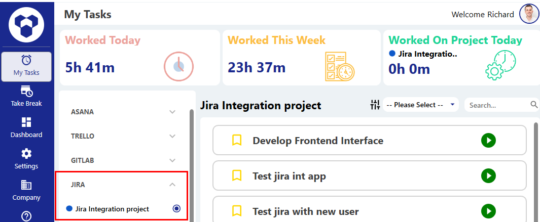 Once Jira tasks are synced and appear in the TraqNext desktop app, you can track them here