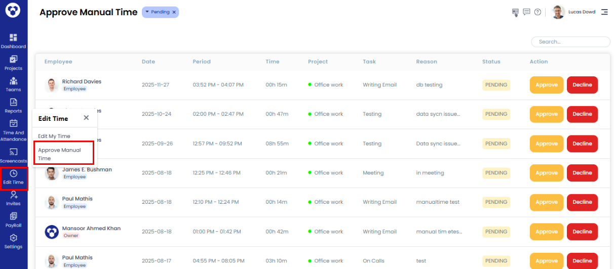 You can approve/decline manual time requests from here Edit Time